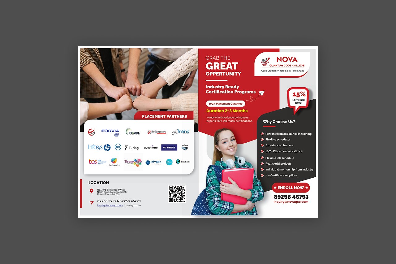 The brochure design is crafted with a clean, professional layout to highlight placement opportunities. Visual elements and structured content ensure clarity, trust, and engagement.